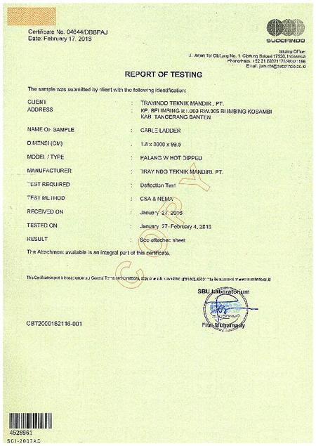 Kabel tray dan kabel ladder merk TrayTEK sudah diuji pada laboratorium Sucofindo dan sesuai dengan standar NEMA VE 1-2009.